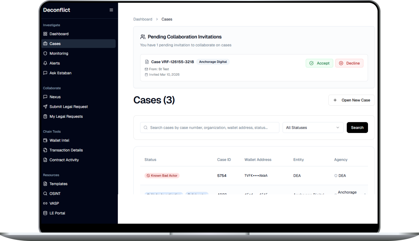 Deconflict is a blockchain security platform that enables users to investigate whether a crypto wallet address has been involved in fraudulent or criminal activities. The platform serves individuals, businesses, and law enforcement agencies by providing wallet verification, fraud reporting capabilities, and real-time case tracking—all within a secure and scalable environment.